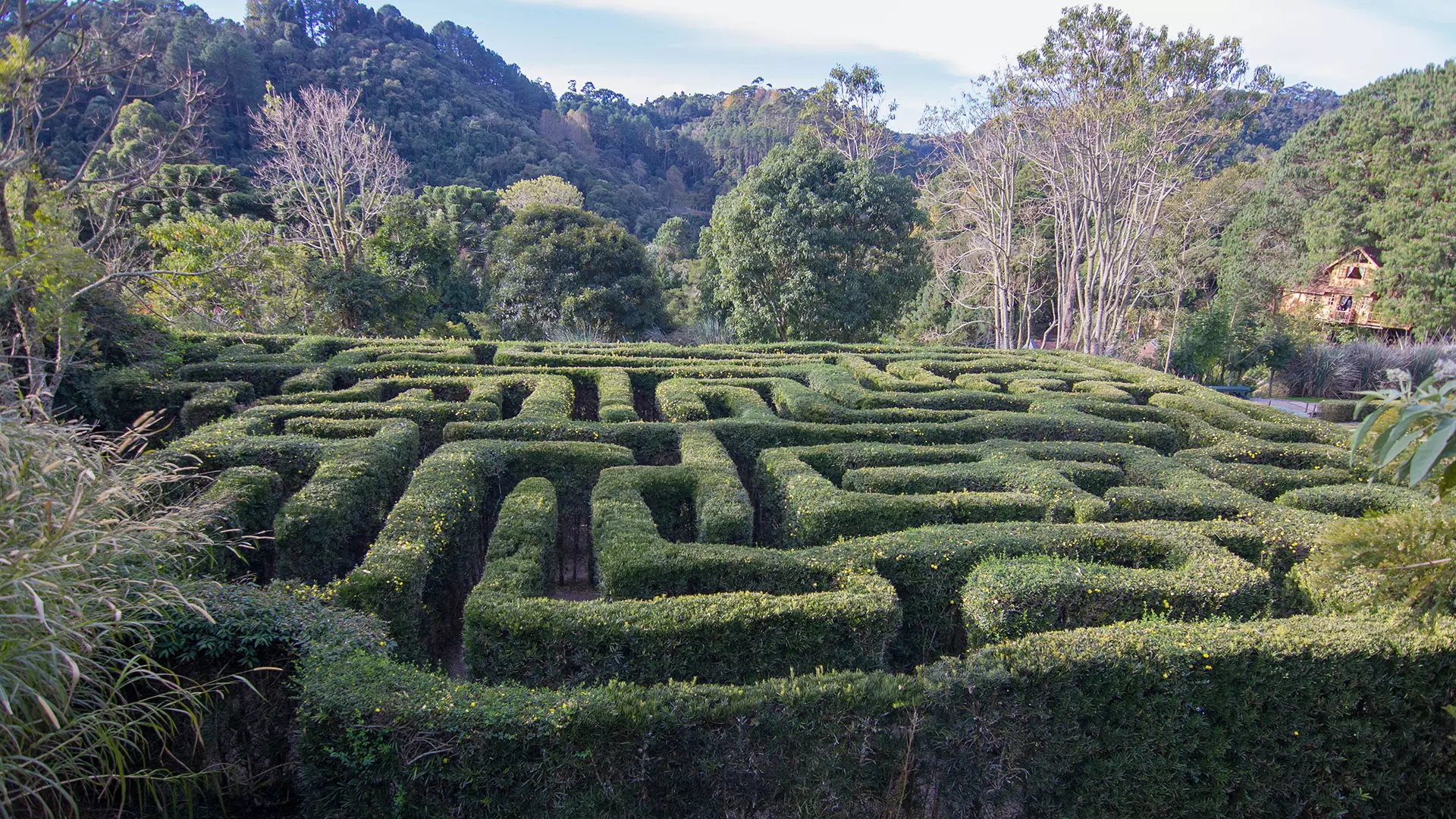 Labirintos: Inclui o icônico labirinto de grama (celta) e um labirinto clássico de arbustos.